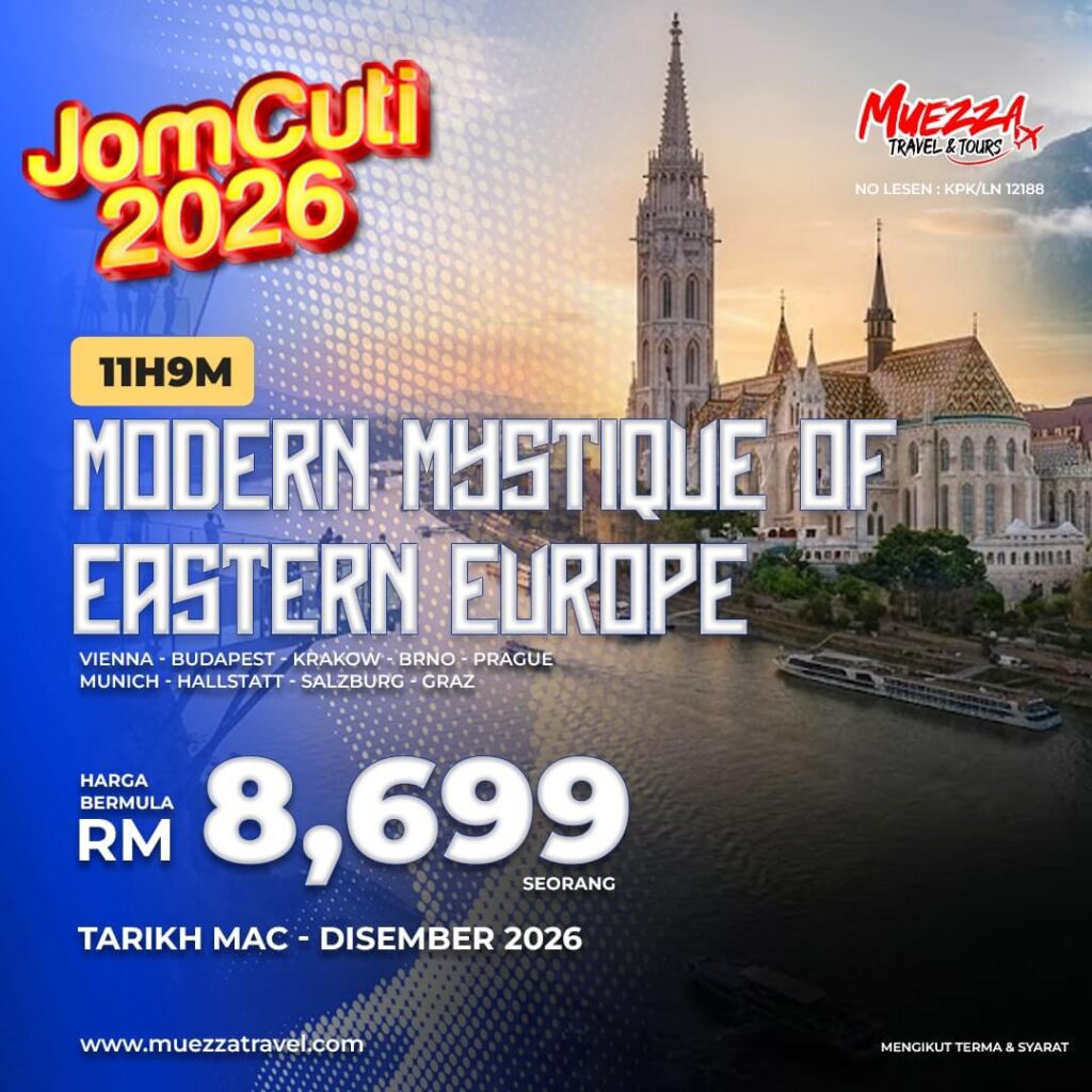 | Hari 9 | BUDAPEST - PENERBANGAN KE KUALA LUMPUR Selepas sarapan dan daftar keluar hotel, anda dibawa ke lapangan terbang untuk menaiki penerbangan pulang ke Kuala Lumpur. Dengan hati yang penuh kenangan indah Sepanjang pengembaraan merentas Eropah dan Balkan, tibalah masa untuk mengucapkan selamat tinggal. Perjalanan ini pastinya meninggalkan memori manis yang akan terus dikenang sepanjang hayat. Sarapan |