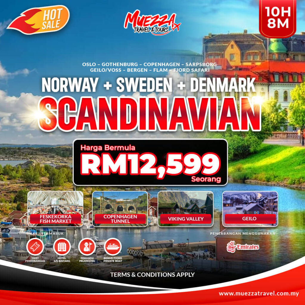 | Hari 1 | KUALA LUMPUR – TRANSIT – OSLO (MOB) Anda akan berkumpul di KLIA dan memulakan perjalanan udara ke Oslo, Norway. Setibanya di Lapangan Terbang Antarabangsa Oslo, anda akan disambut oleh pemandu dan terus menuju ke bandar.