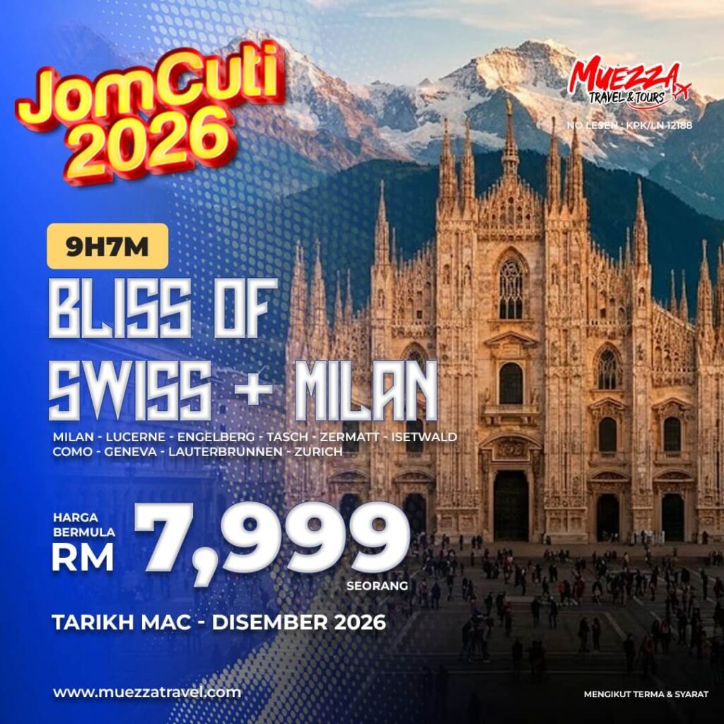 Nikmati gabungan sempurna kota fesyen Itali dan keindahan alam Switzerland dalam satu perjalanan eksklusif. Dari Milan yang bergaya, ke tasik romantik Lake Como, hingga panorama alpine Switzerland yang memukau. Pakej ini menjanjikan pengalaman Eropah yang tenang, indah dan penuh kenangan istimewa.